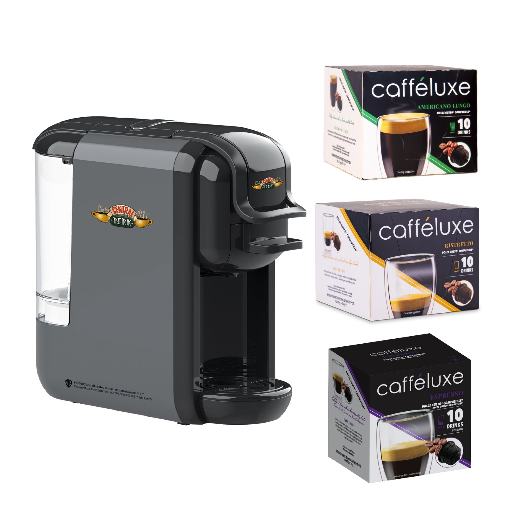 Caffeluxe F.R.I.E.N.D.S DUO Machine | Nespresso® & Dolce Gusto® Compatible | Central Perk + 1 x Americano, 1 x Espresso, 1x Ristretto FREE